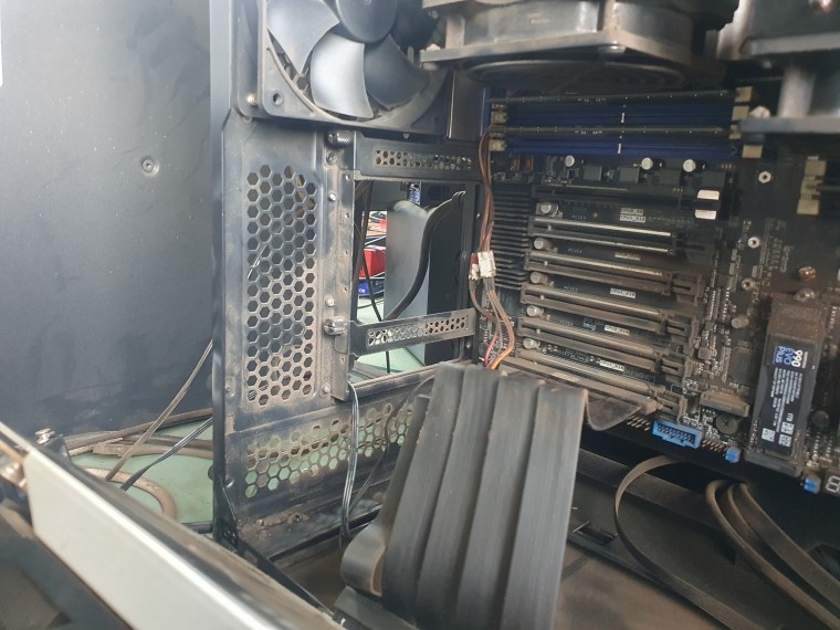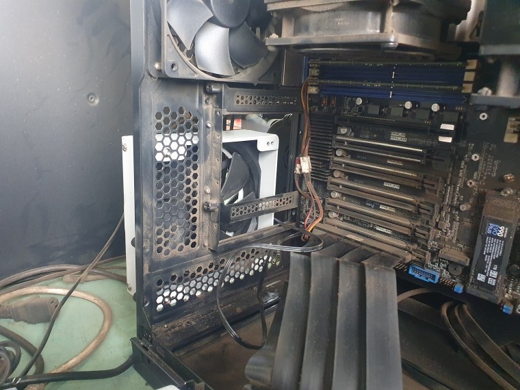 예전 델 케이스에 했던 짓 그대로 팬을 외부에 붙일려고 보니 급하게 뭘 만들 정신은 없고 걍 나사셋으로 팬만 고정해놨었습니다